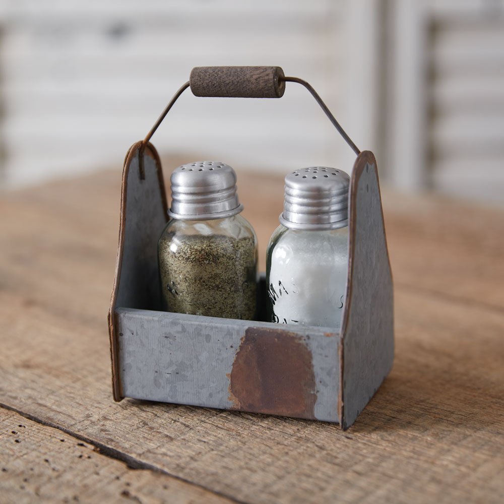 Everything but the kitchen sink! Our unique Lunch Pail Salt and Pepper Caddy makes eating a meal fun and stays true to your rustic style. It features two mason jar salt and pepper shakers. Please wash before use.
